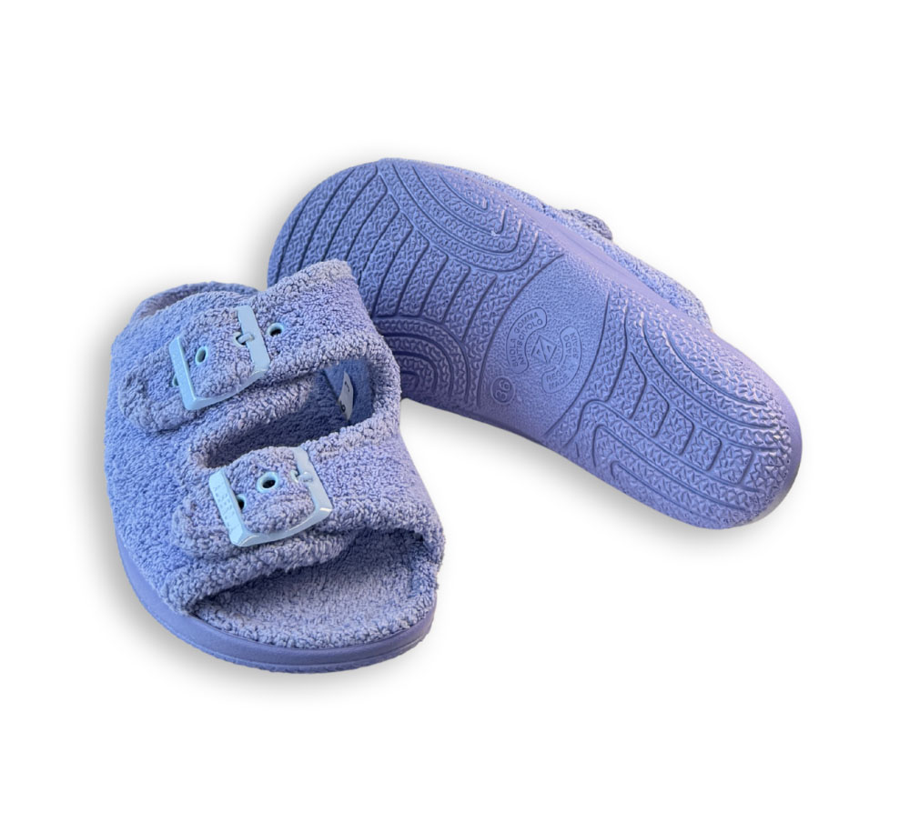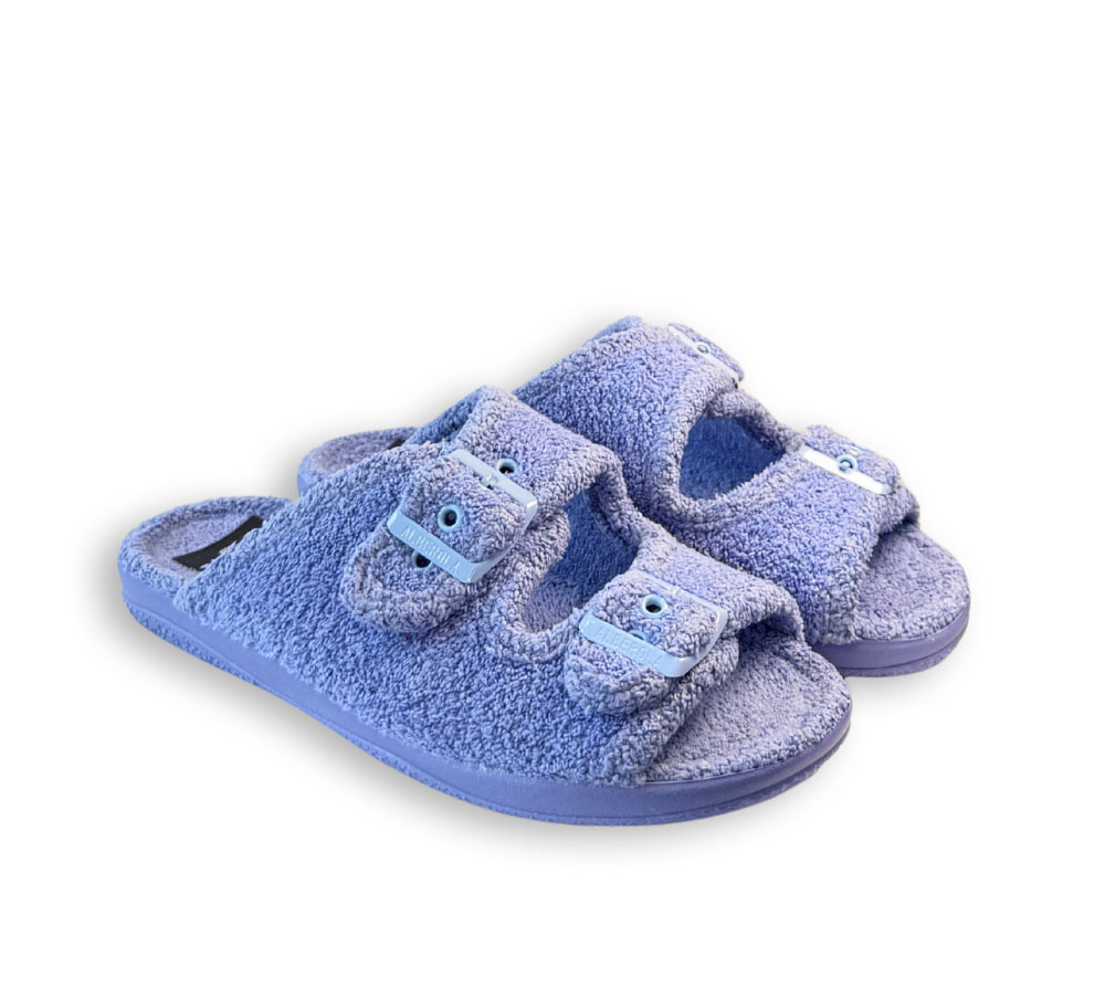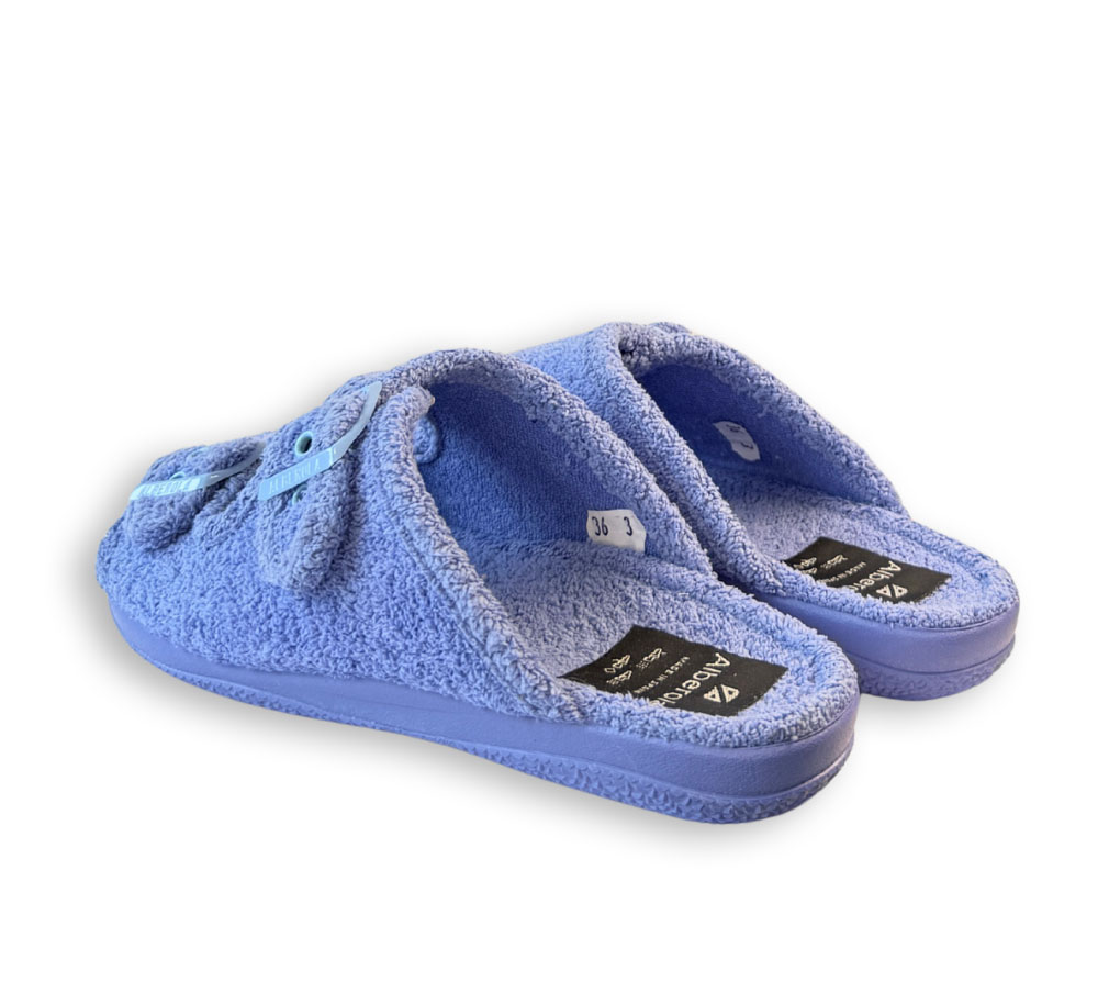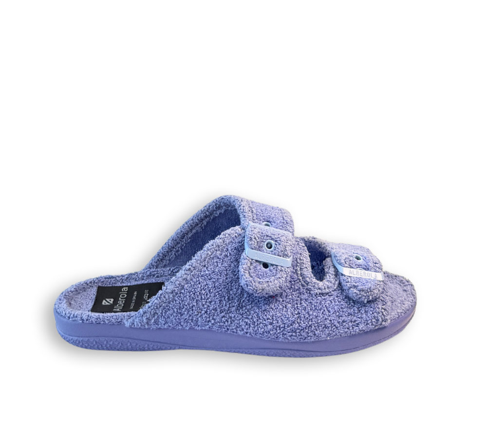 Zapatillas de casa para mujer de la marca Alberola, fabricadas en tejido tipo toalla en color azul. Un modelo cómodo, ligero y perfecto para el día a día en casa.