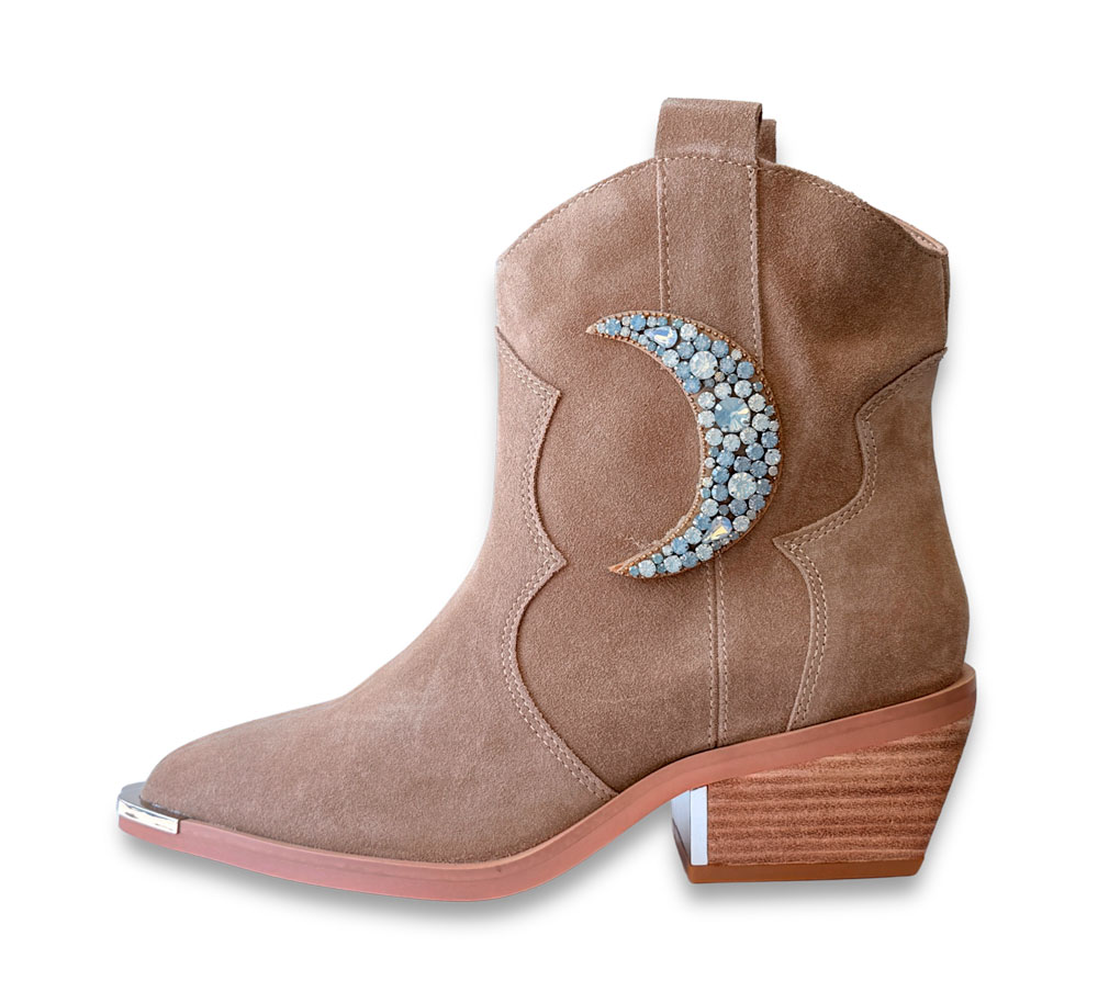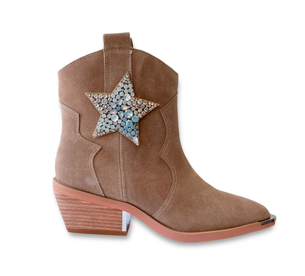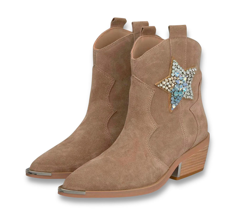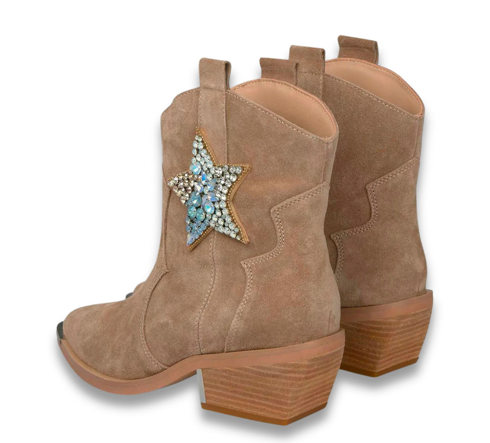 Envíos gratis a partir de 100€.Botín cowboy Alma en Pena para mujer en crosta visón con estrella lateral de pedrería, puntera metálica y tacón medio de estilo western.