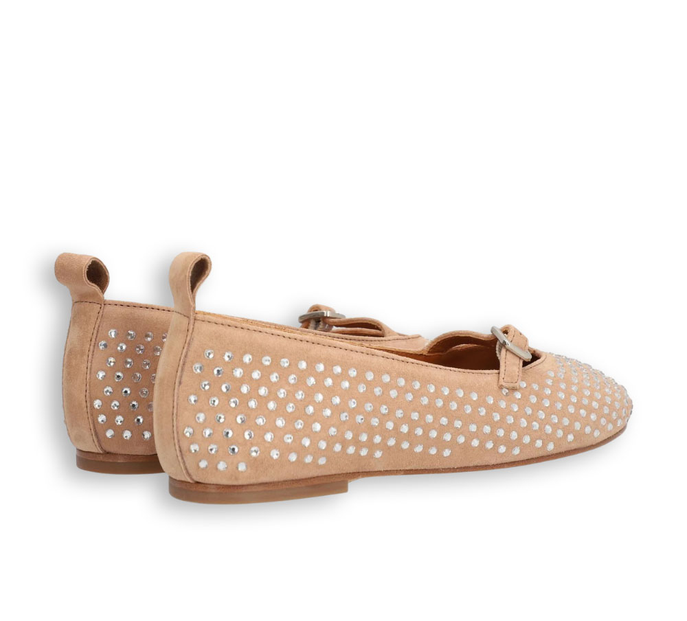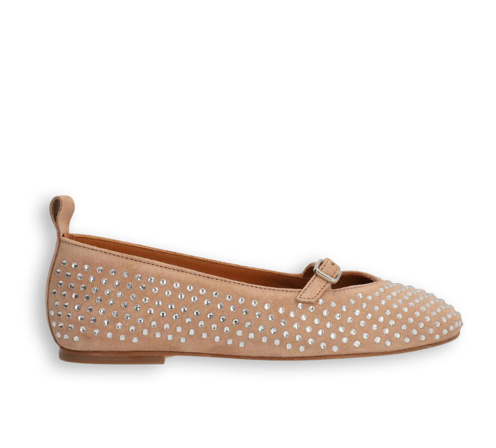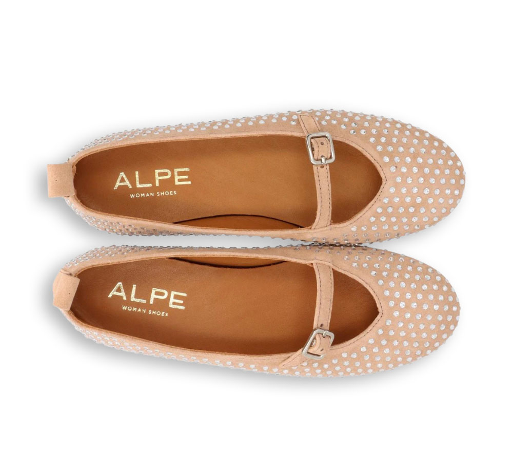 Bailarina Alpe modelo Liss para mujer fabricada en piel color nude (make up) con un elegante diseño decorado con pedrería. Su silueta femenina con puntera redonda aporta un estilo sofisticado que combina fácilmente con cualquier look.
