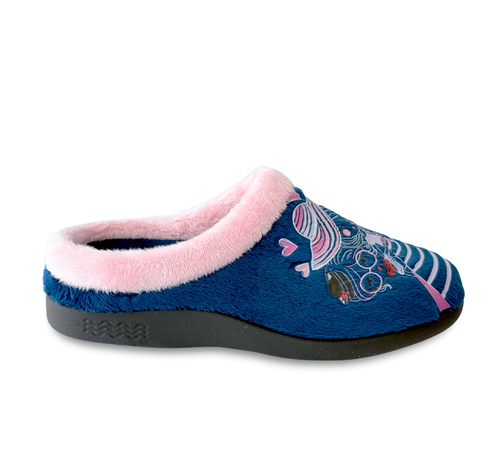 Envíos gratis a partir de 100€.Zapatilla de casa Flossy para mujer en color azul con diseño de chica ilustrada, interior aterciopelado rosa y suela antideslizante, ideal para comodidad y abrigo diario.