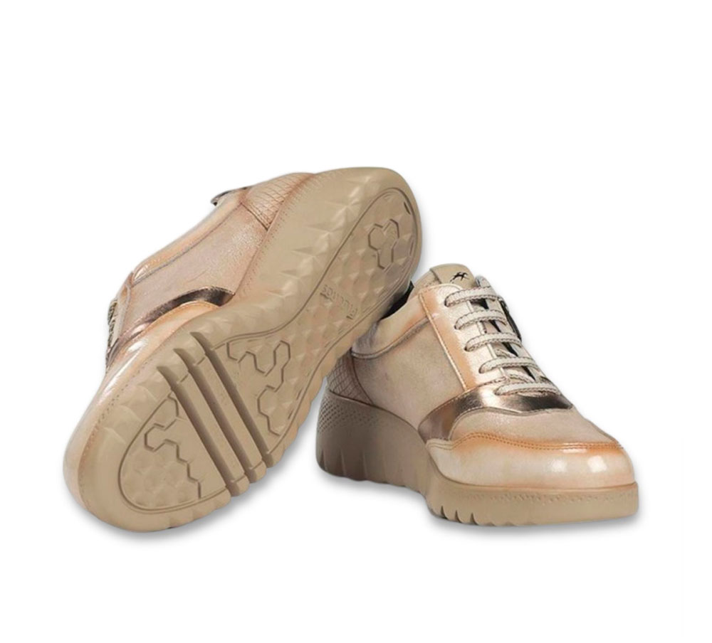 El Fluchos Live combina elegancia y comodidad en un diseño urbano ideal para cualquier ocasión. Elaborado en piel beige con toques metalizados dorados, fusiona estilo y practicidad con un cierre mixto de cordones y cremallera lateral que facilita el calce. Su plantilla acolchada extraíble proporciona confort durante todo el día, mientras que la suela de goma ligera garantiza flexibilidad y agarre. Con una altura de 4,5/2 cm, este modelo fabricado en España será tu aliado perfecto para looks casuales y elegantes.