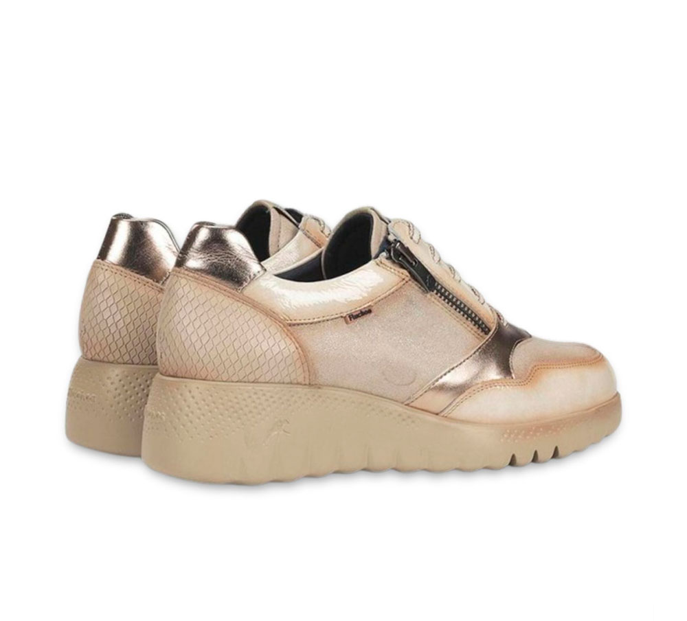 Envíos gratis a partir de 100€.Deportivo Fluchos Live para mujer, confeccionado en piel beige con detalles en oro metalizado. Su diseño sencillo y femenino lo convierte en un básico versátil para el día a día. Incorpora cierre con cordones y cremallera lateral, plantilla extraíble acolchada y suela ligera de goma. Hecho en España.
