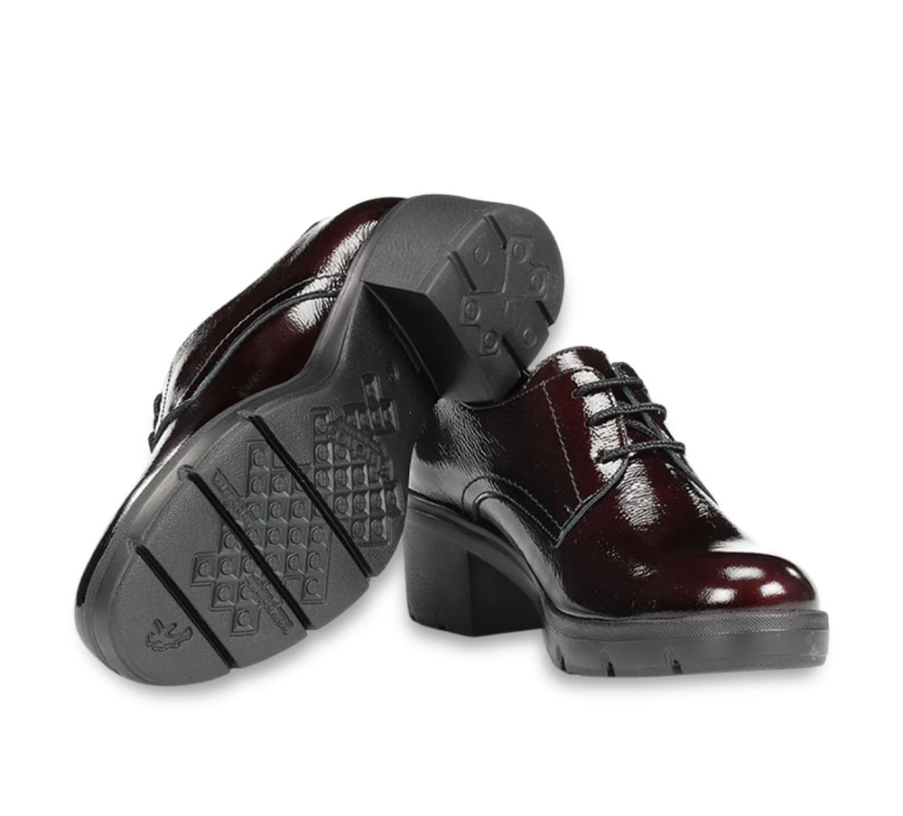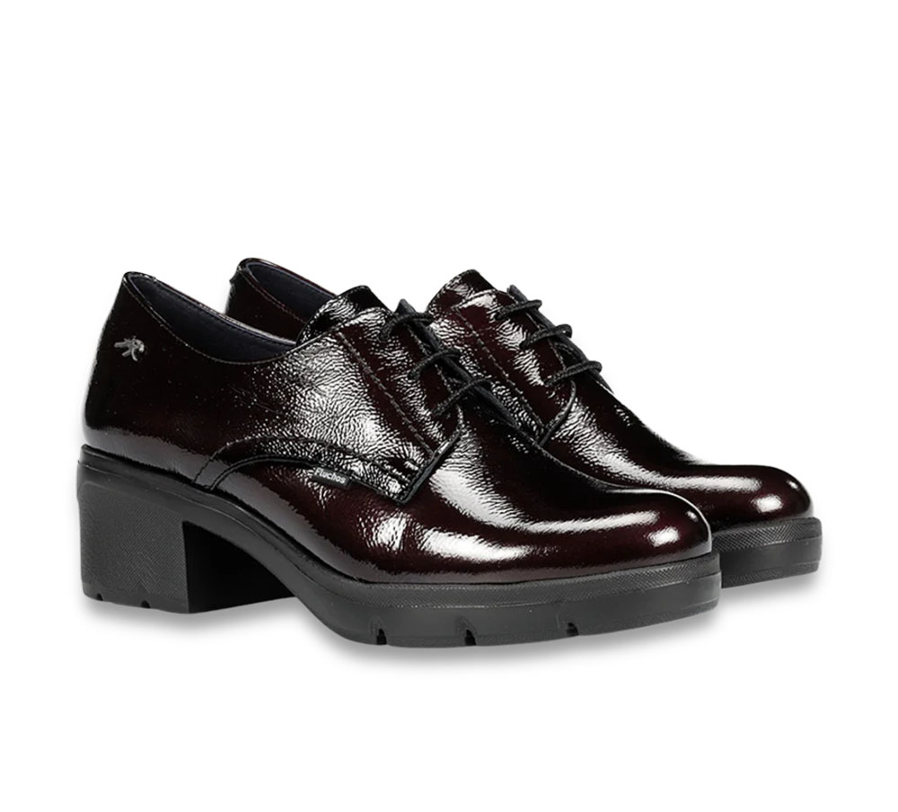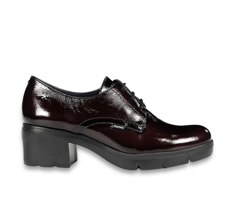 Envíos gratis a partir de 100€.Zapato de mujer Fluchos en piel burdeos charol, con cordones, tacón ancho y suela flexible que aporta elegancia, confort y máxima amortiguación.