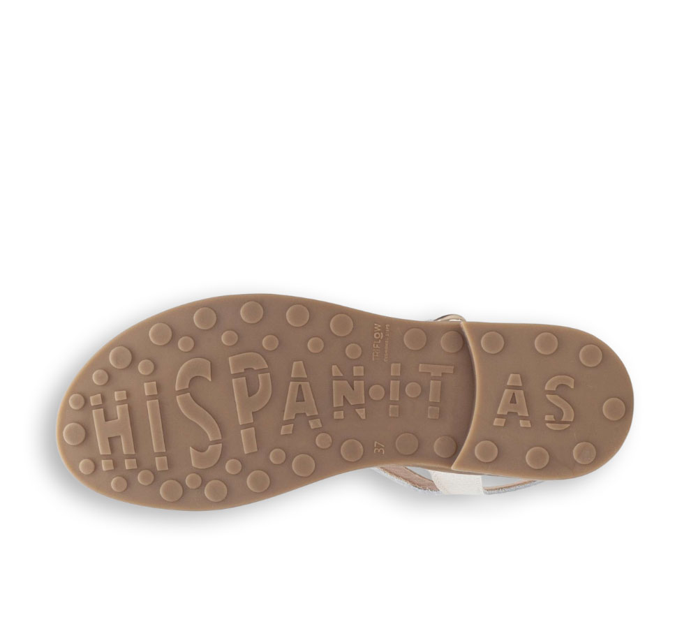 Sandalia Hispanitas balinesa para mujer en color blanco fabricada en piel de vacuno. Su diseño ligero con detalle decorativo en forma de infinito aporta un toque elegante y moderno.