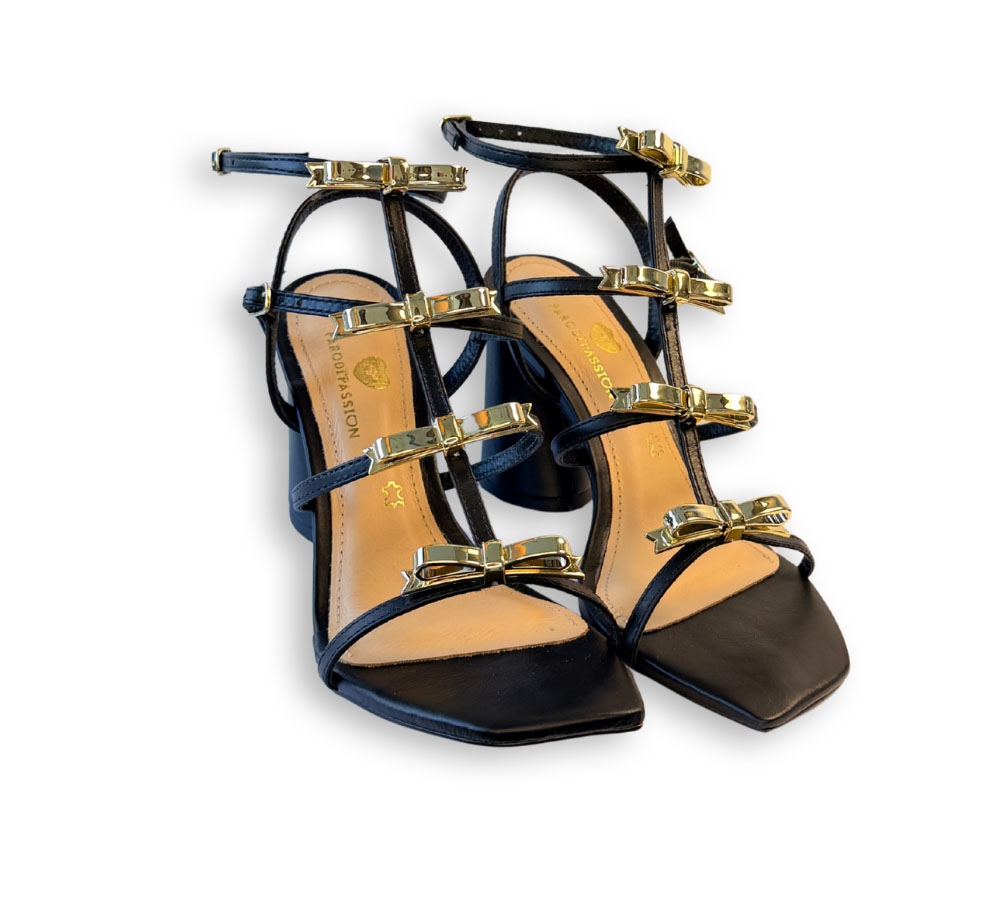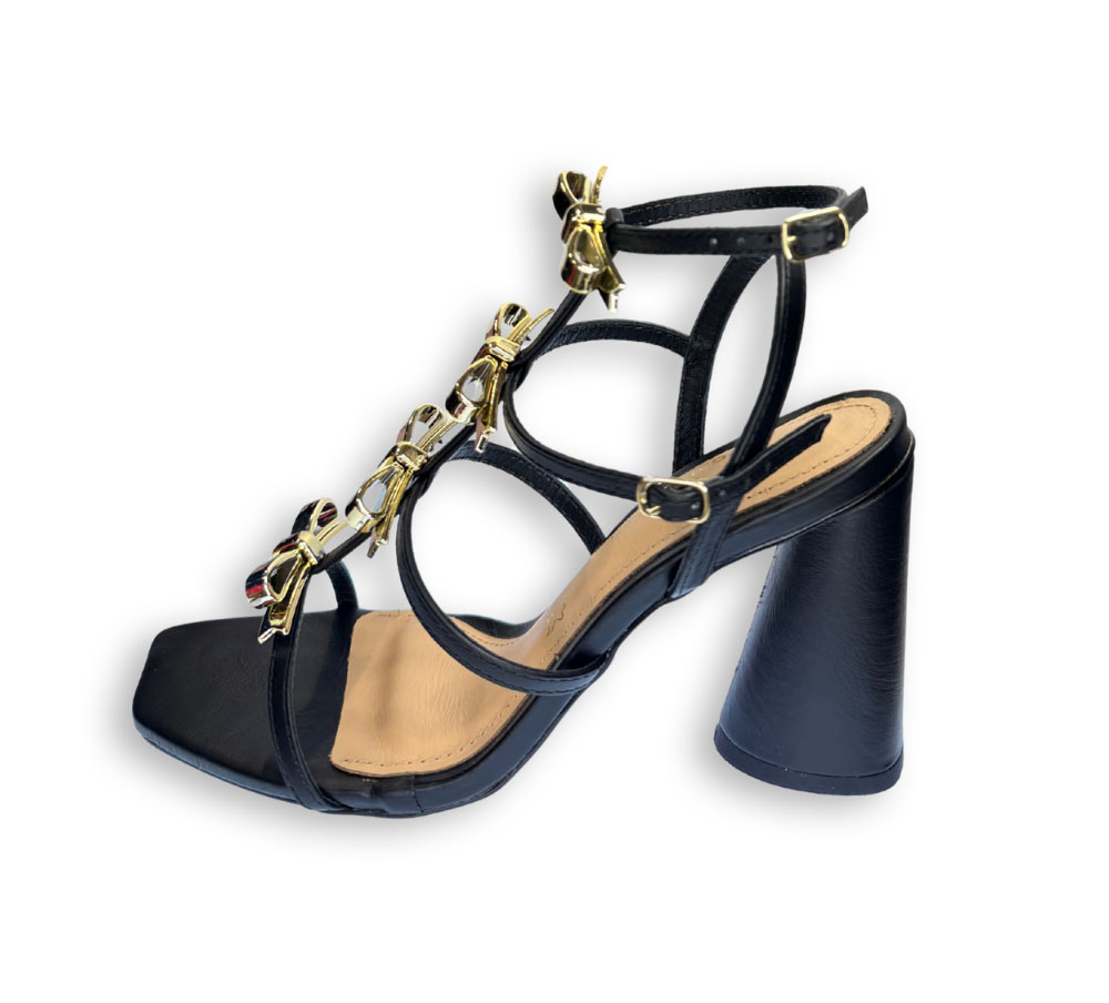 Sandalia de tacón para mujer en color negro de la marca Parodi’s Passion. Un diseño cuidado al detalle, con tiras finas y apliques dorados que aportan un toque sofisticado y actual.
