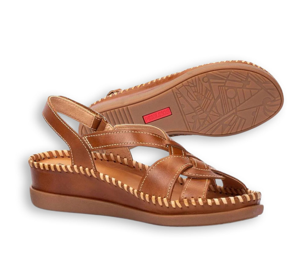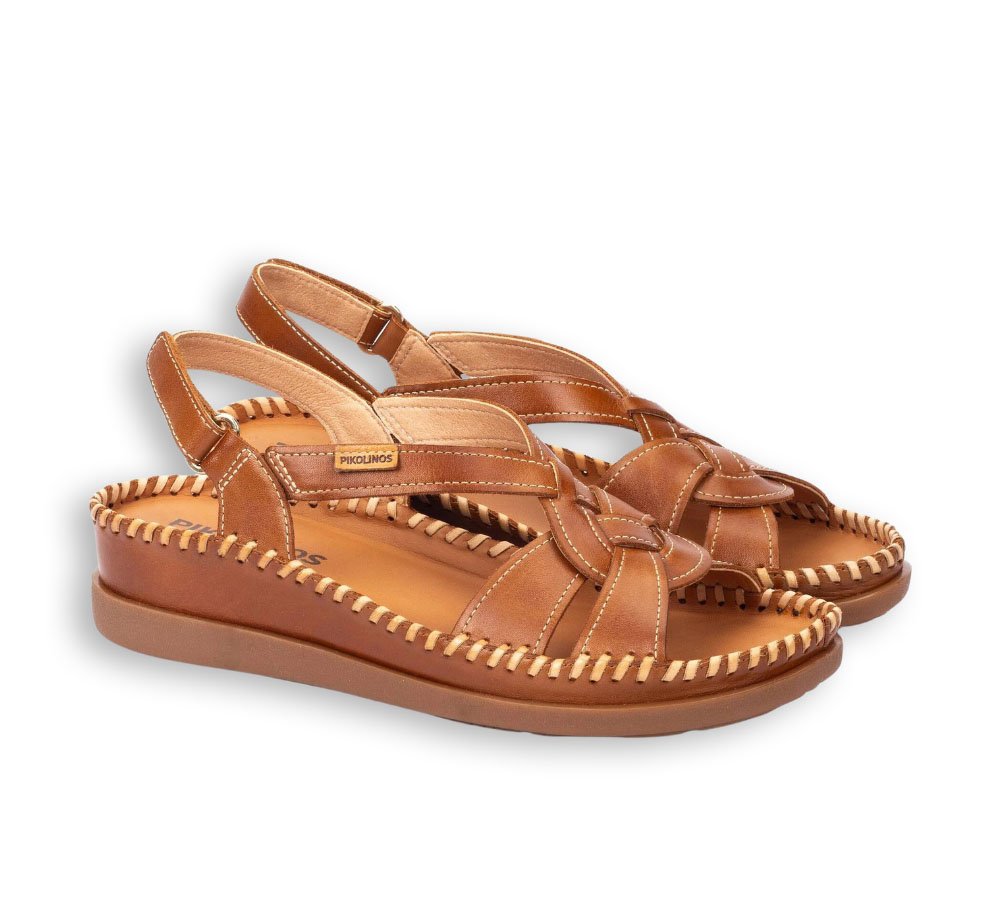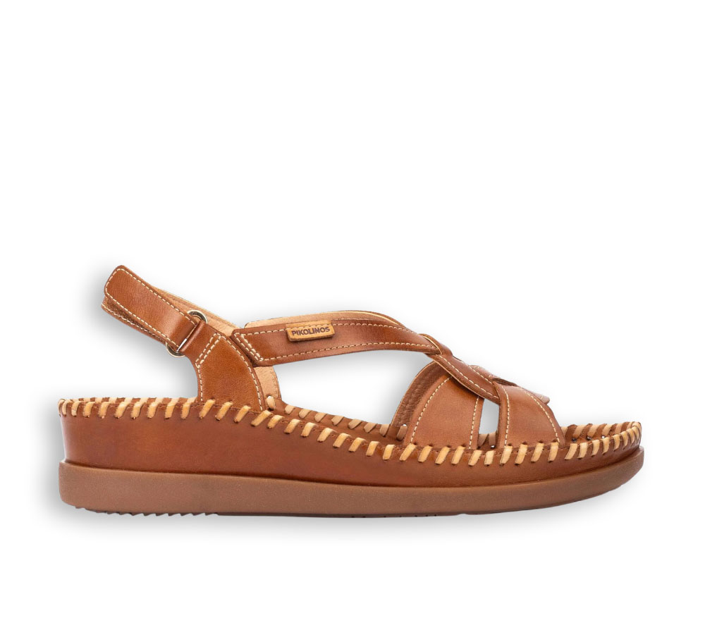 Sandalia Pikolinos modelo Cadaques para mujer en color cuero fabricada en piel de alta calidad. Su diseño ligero y flexible proporciona una pisada cómoda, ideal para el uso diario durante la temporada de primavera y verano.
