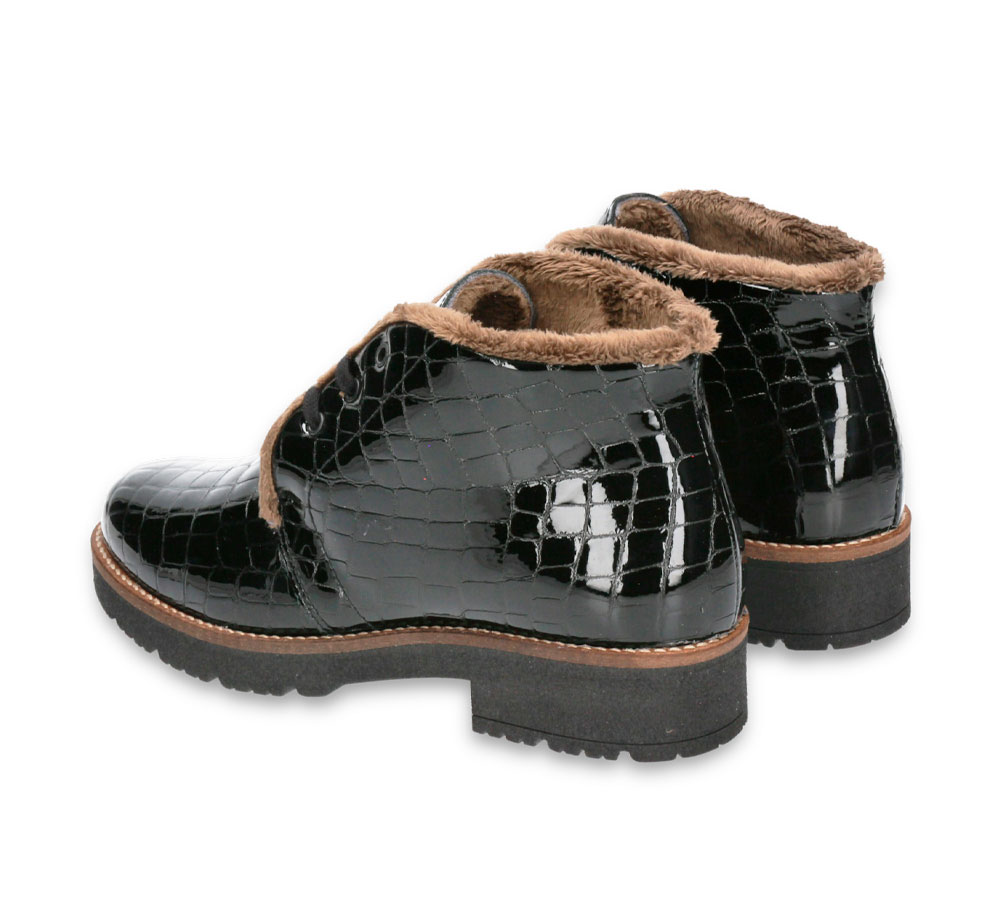 El botín de mujer Pitillos en color negro combina elegancia y calidez gracias a su diseño en charol efecto cocodrilo y el detalle de pelo interior que aporta abrigo y confort en cada uso. Fabricado con materiales de alta calidad, este modelo asegura resistencia y durabilidad, mientras que su cierre con cordones ofrece un ajuste firme y personalizado. La suela robusta antideslizante garantiza seguridad en cada paso, ideal para los días fríos de invierno. Un calzado versátil que se adapta tanto a looks casuales como más sofisticados, aportando estilo y comodidad.