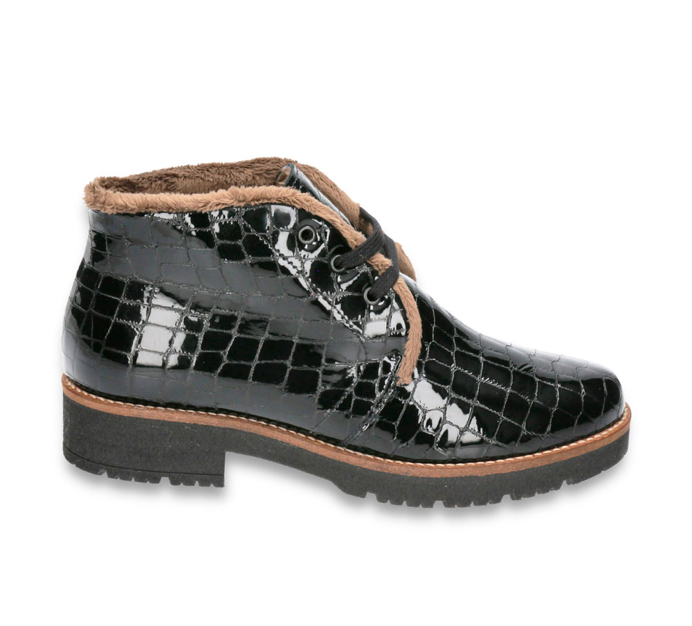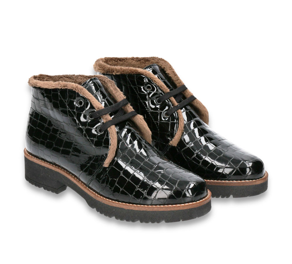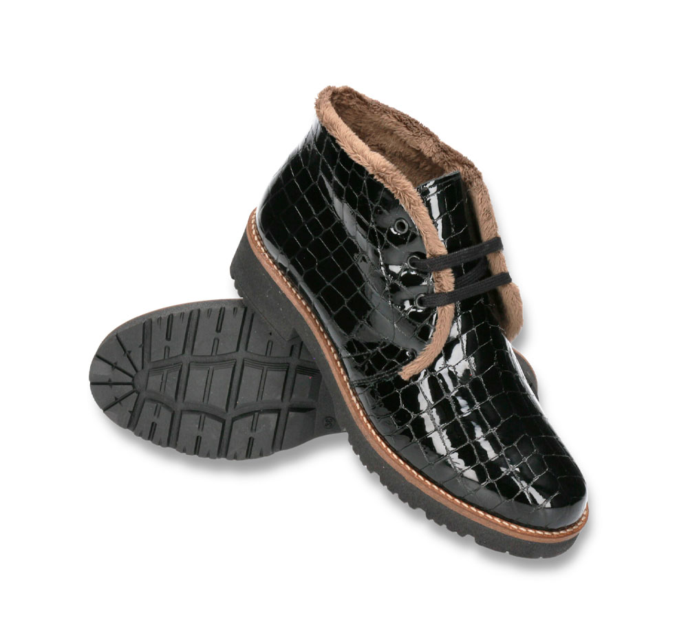 Envíos gratis a partir de 100€.Botín de mujer Pitillos en charol negro con interior de pelo, cierre con cordones y suela antideslizante, ideal para comodidad y abrigo diario.