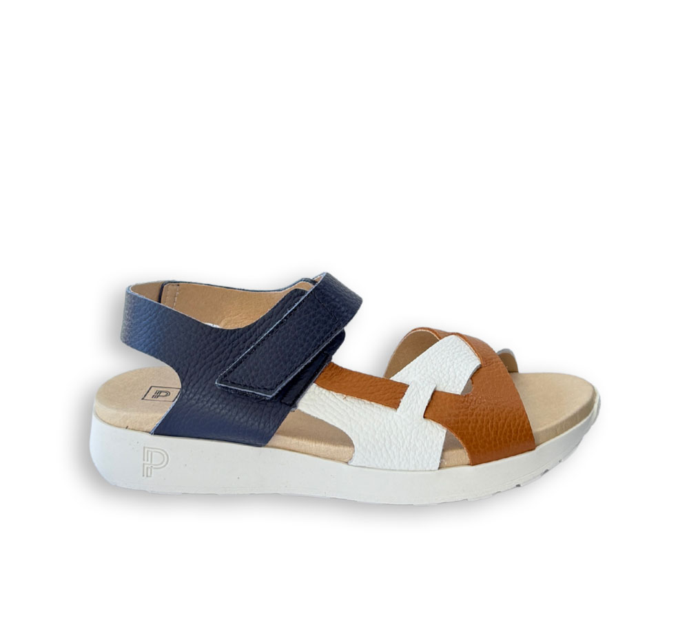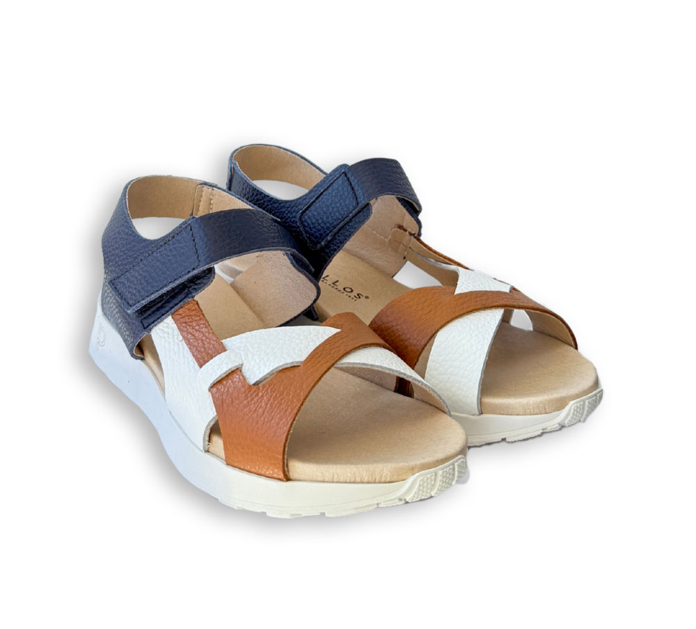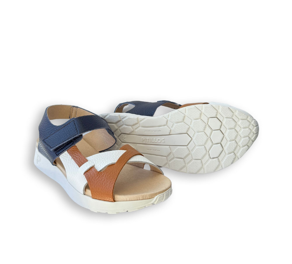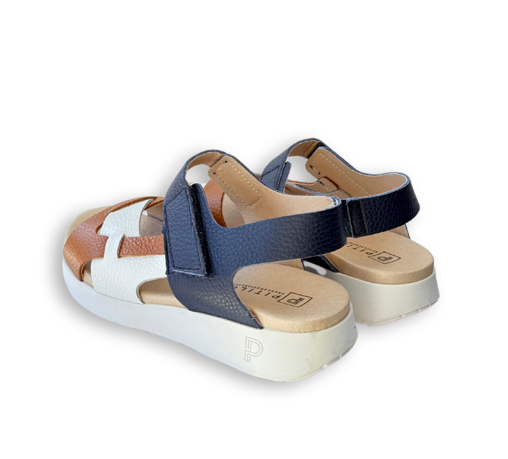 Sandalia Pitillos para mujer modelo 11230 con diseño moderno en combinación de colores azul, blanco y cuero. Su estilo casual y veraniego la convierte en una opción perfecta para el día a día.