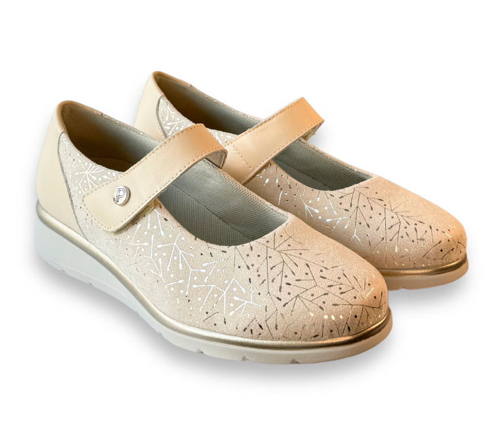 Zapato Pitillos para mujer en color beige, fabricado en piel y con diseño cómodo de cierre con velcro. Un modelo práctico y elegante pensado para el día a día.
