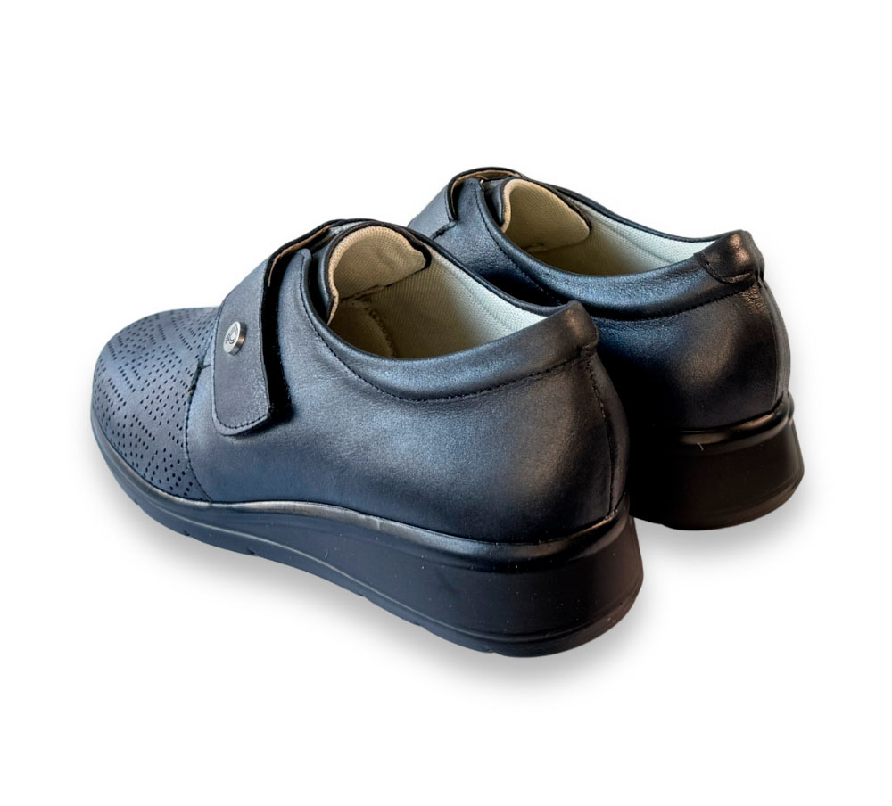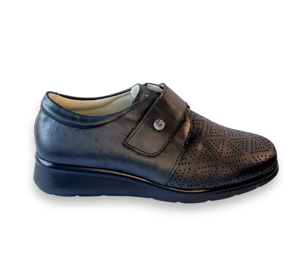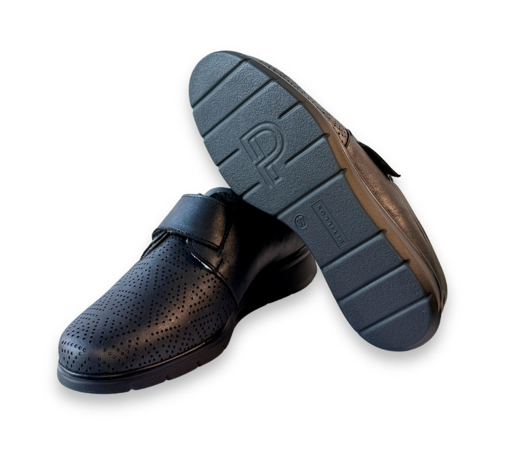 Zapato Pitillos para mujer en color negro, fabricado en piel y diseñado para ofrecer comodidad y flexibilidad en cada paso. Su cierre de velcro permite un ajuste fácil y seguro, adaptándose perfectamente al pie.