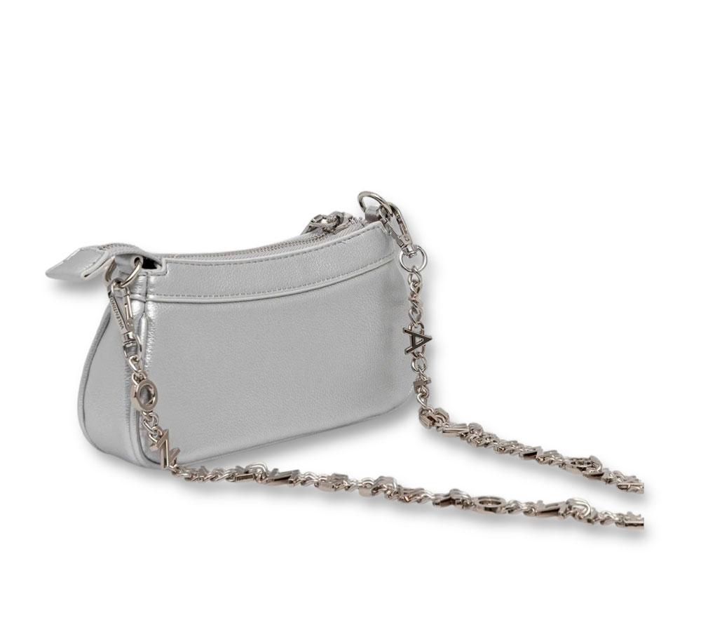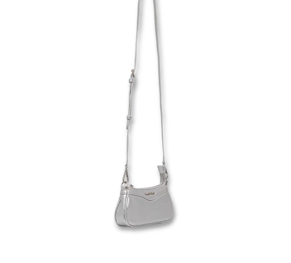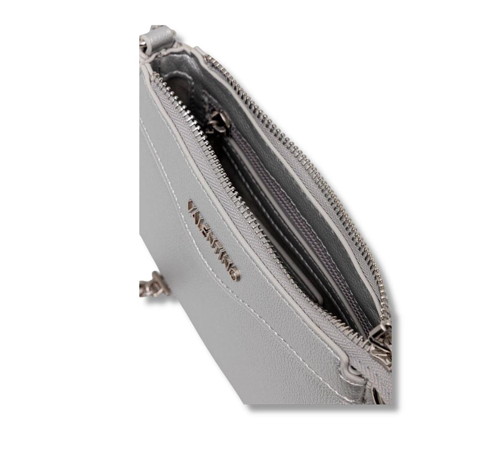 Bolso ELLY de Valentino Bags en color plata, diseño compacto con herrajes metálicos, cierre de cremallera y correa versátil para hombro o bandolera.