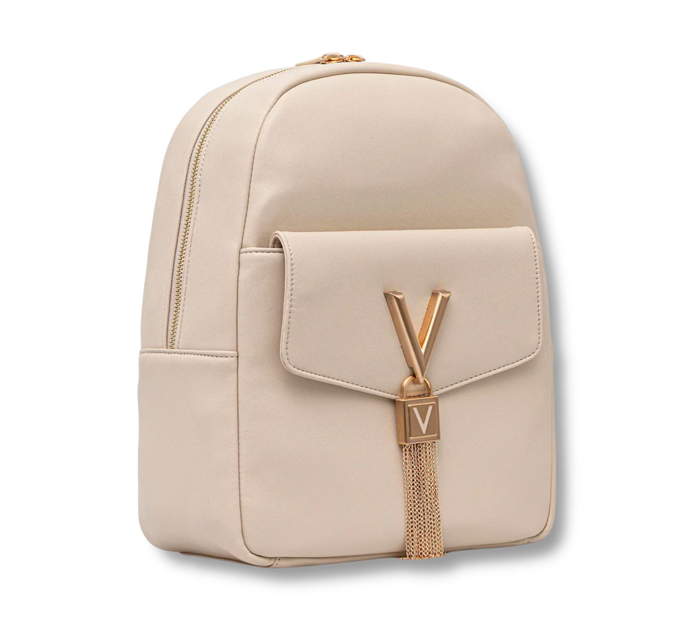 La Mochila Valentino Bags Stella VBS9AK20 en color beige destaca por su diseño moderno y funcional. Confeccionada en poliuretano de alta calidad, mide 26 x 29 x 12 cm y pesa 0,6 kg. Cuenta con un compartimento principal con cierre de cremallera, un bolsillo frontal con aplicación decorativa y una correa de hombro ajustable. Ideal para el uso diario o para ocasiones especiales.