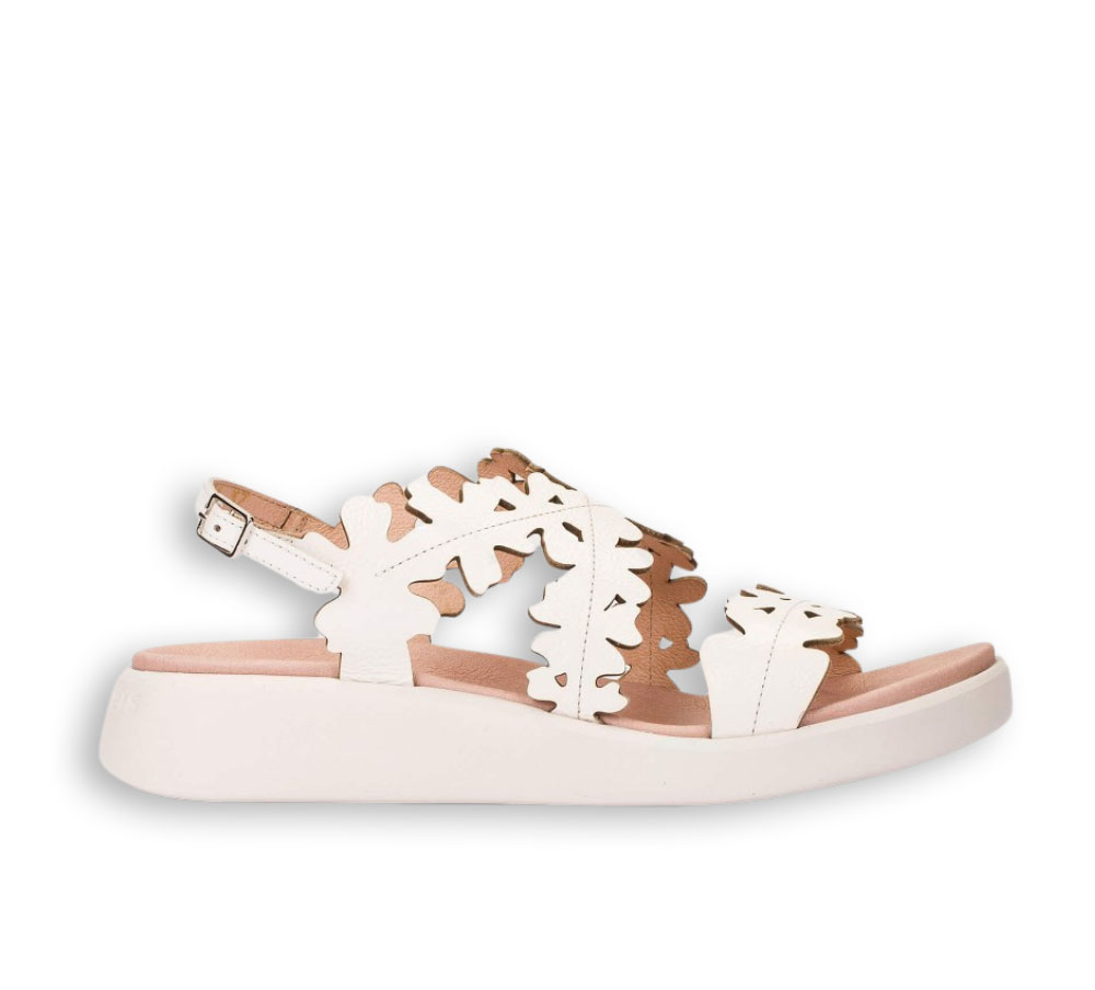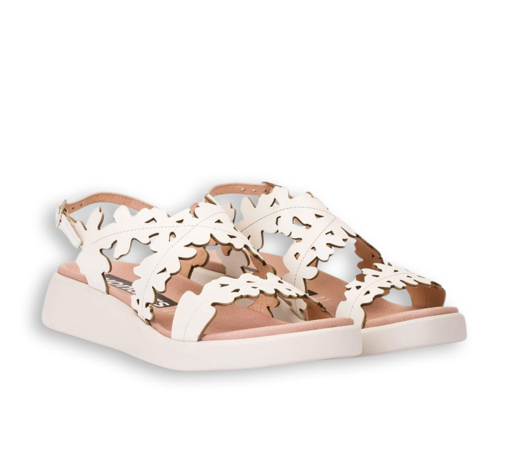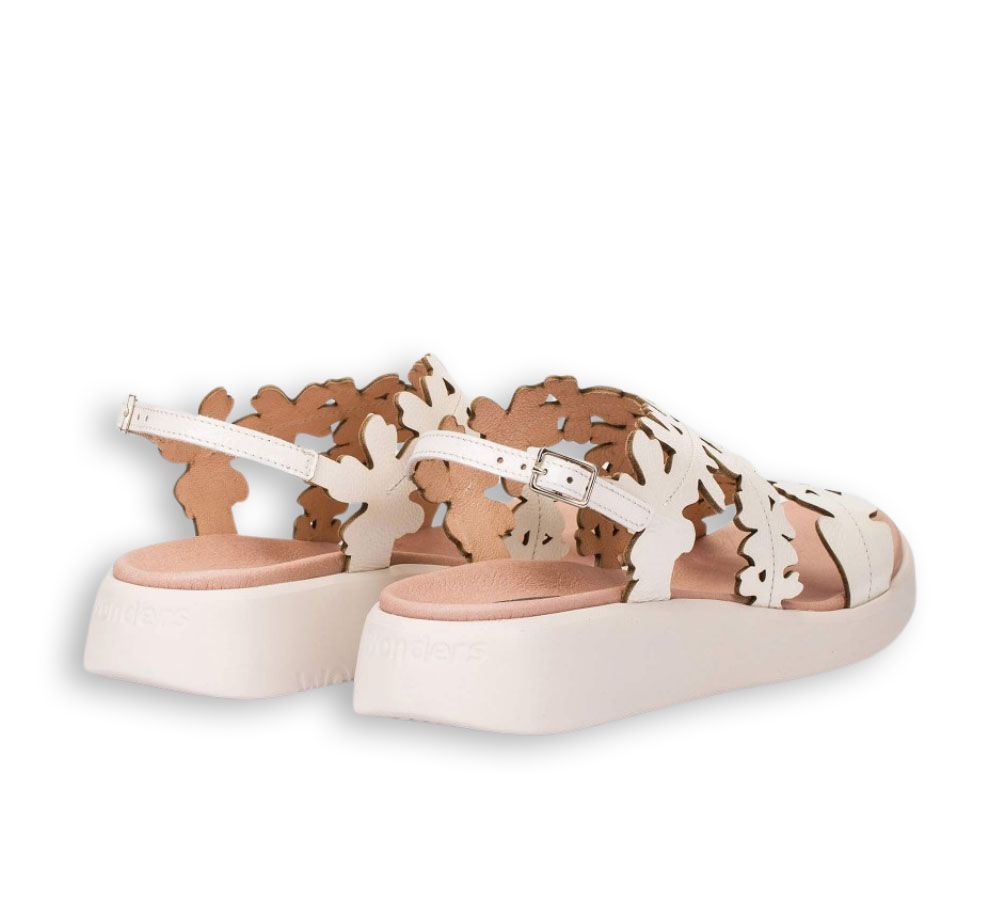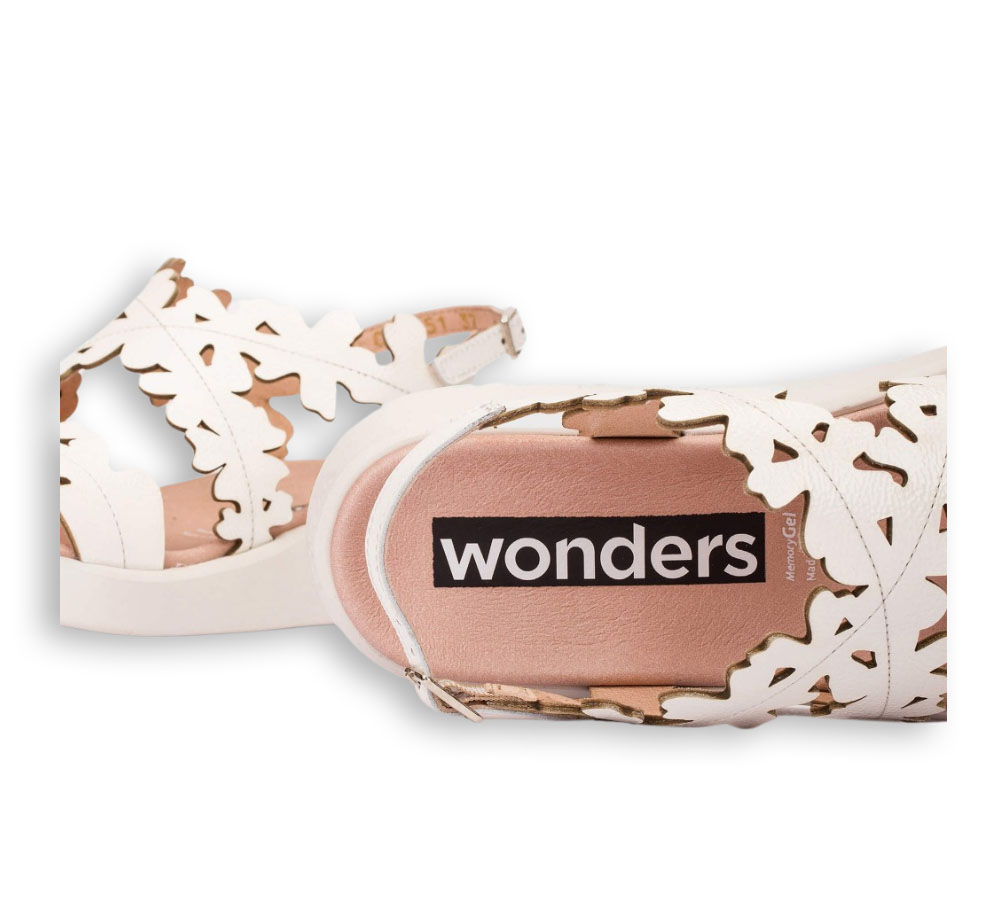 Las sandalias de mujer Wonders en color blanco con acabado en charol destacan por su diseño troquelado de inspiración floral, que aporta ligereza y un estilo actual.