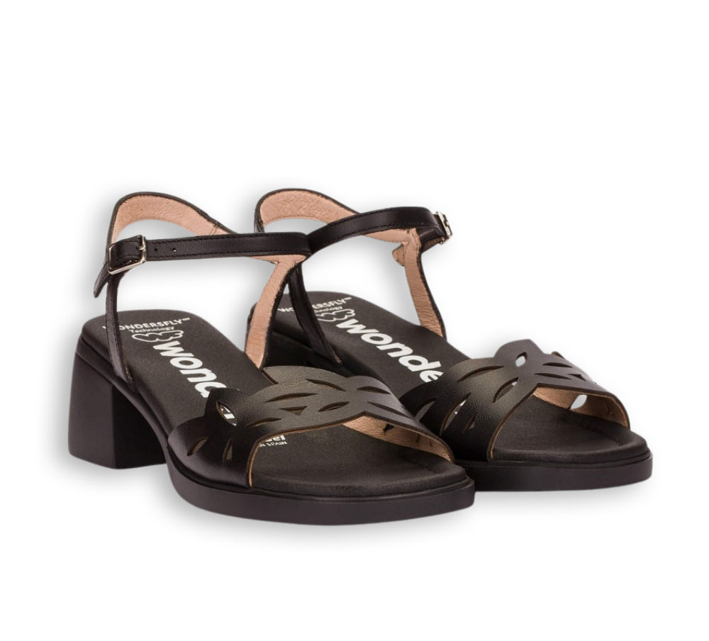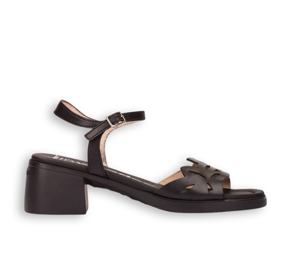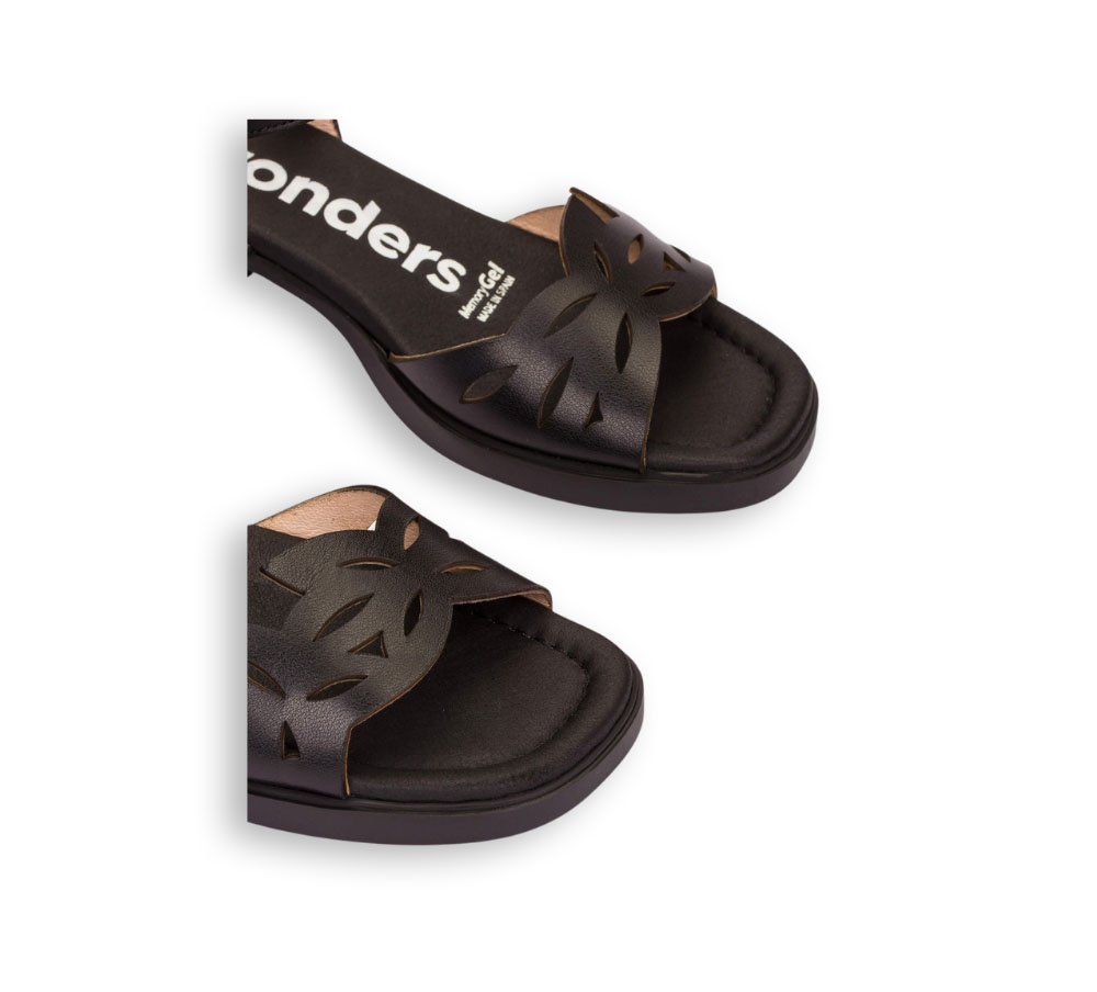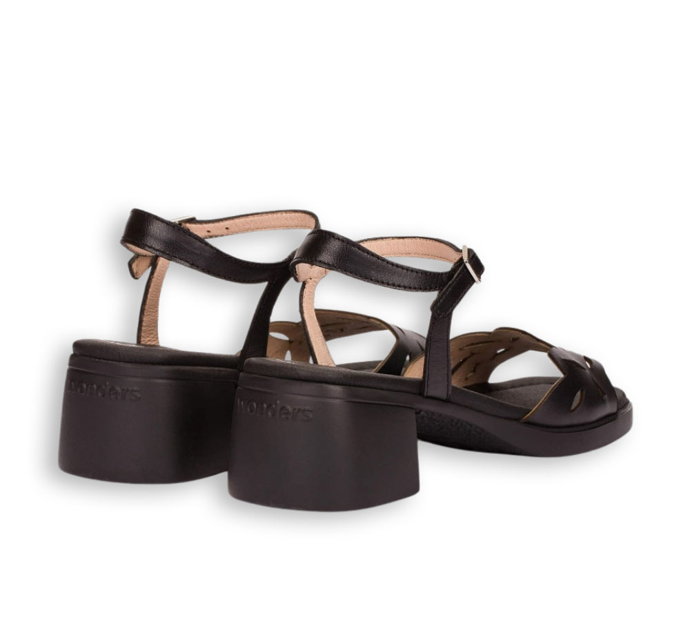 Las sandalias de mujer Wonders en color negro combinan diseño y comodidad en un modelo ideal para la temporada primavera-verano. Fabricadas en piel, destacan por su pala con troquelado que aporta ligereza y un estilo actual.